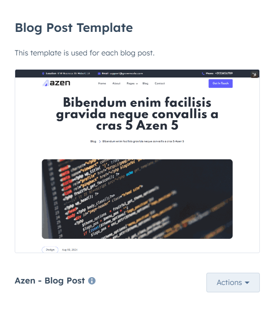 In the Blog Post section, click the Actions dropdown menu to manage your blog post template: