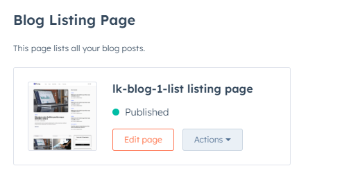 In the Blog Listing section, click the Actions dropdown menu to manage your blog post template: