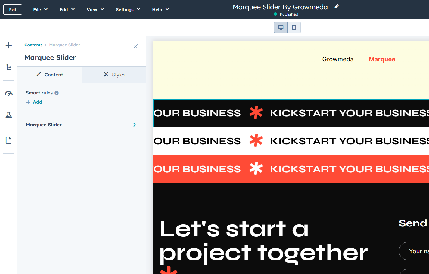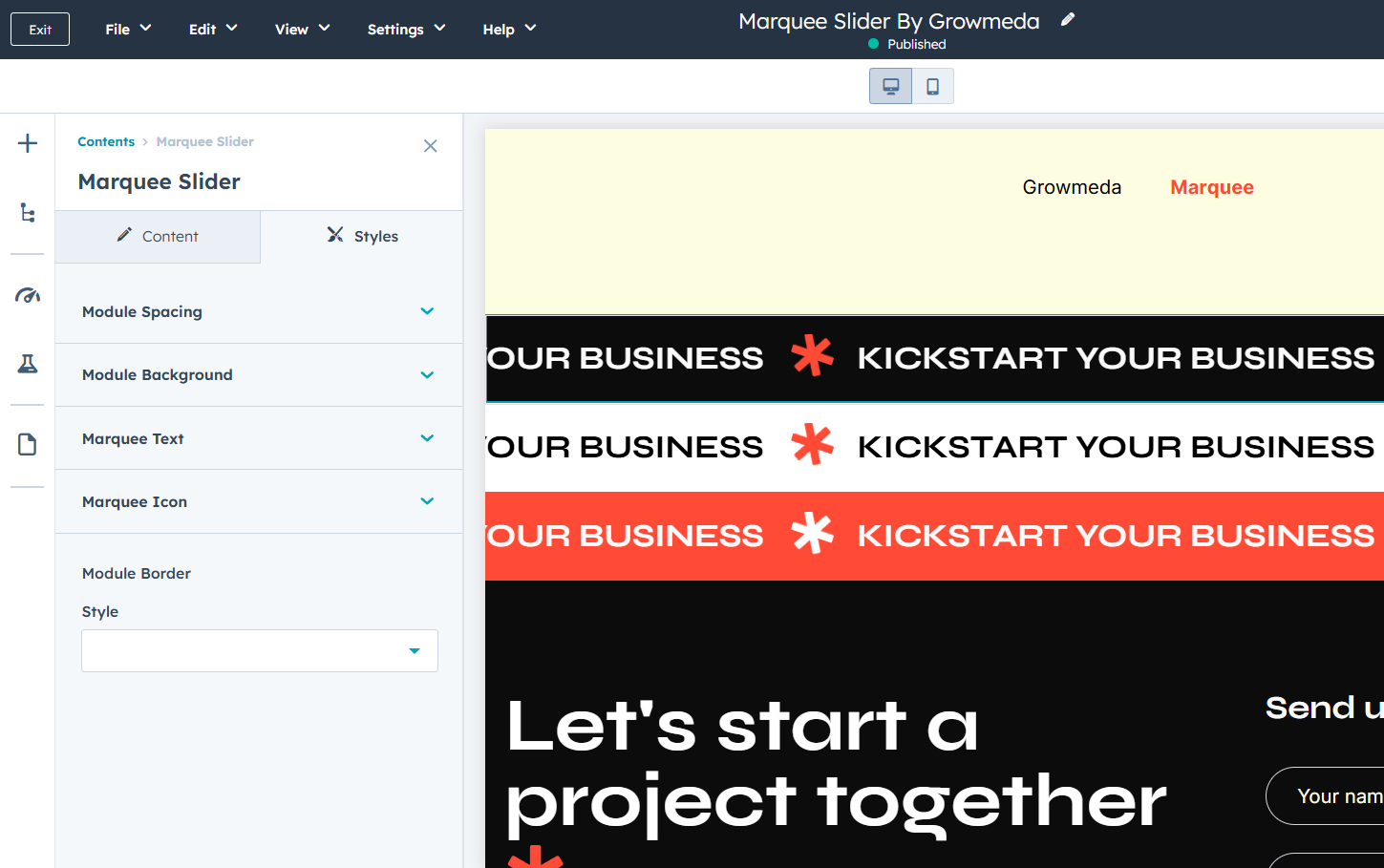 Preview: https://growmeda-4719755.hs-sites.com/marquee-slider-by-growmeda